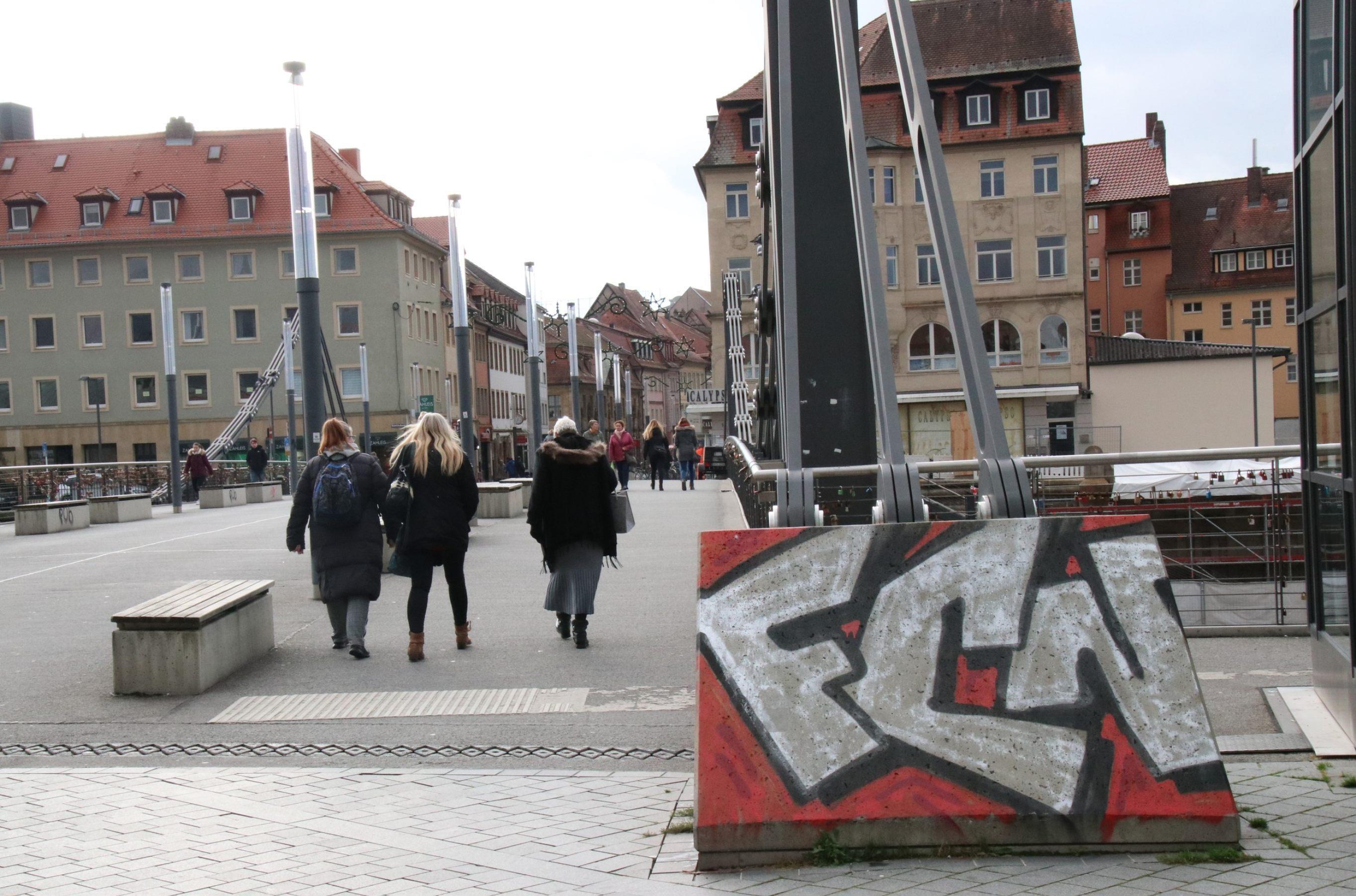 Schmierereien stören an vielen Orten der Stadt, nur wenige Graffiti sind kunstvoll. Die FCN-Symbole an der Kettenbrücke hat die Stadt entfernt.