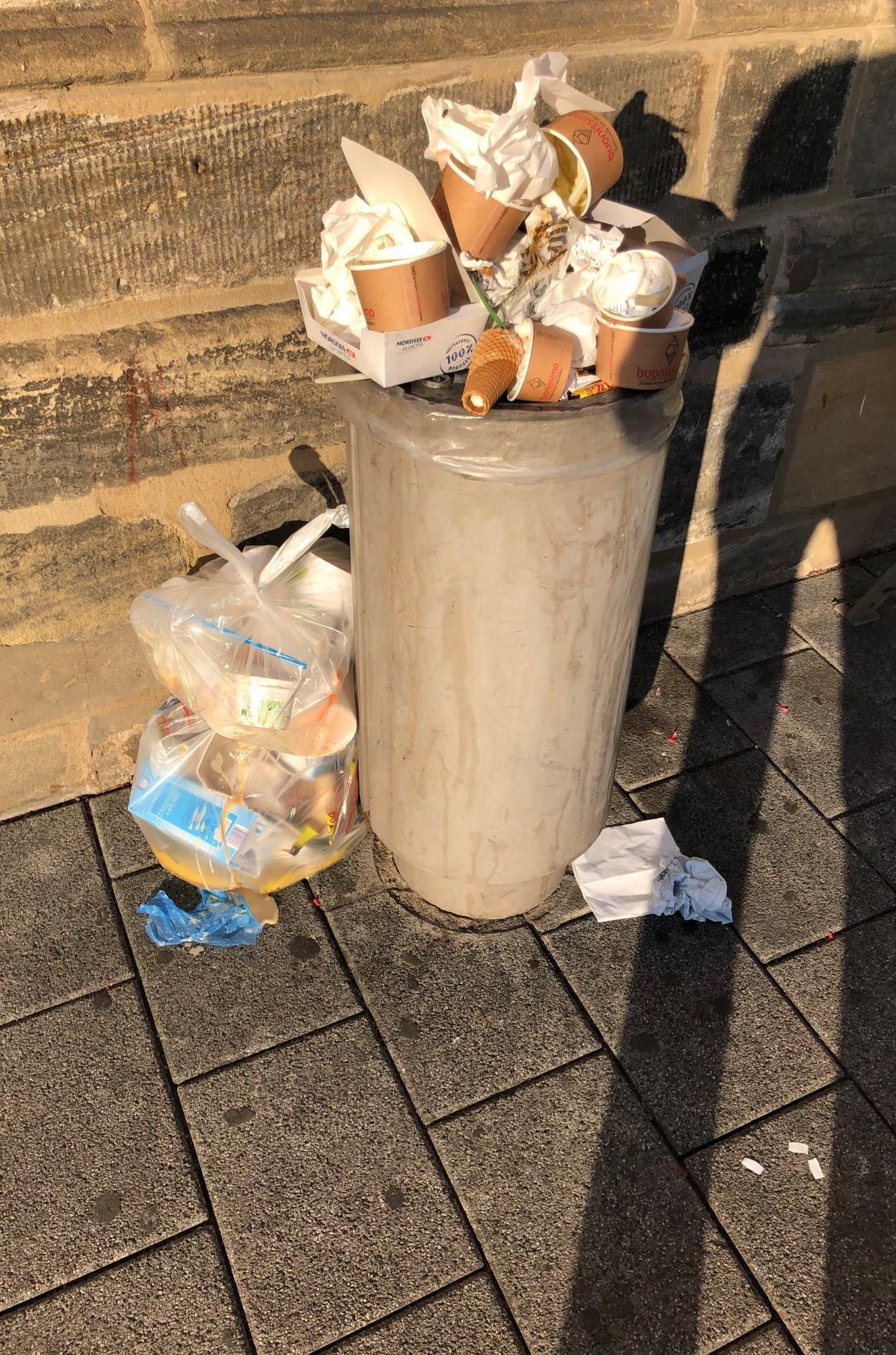 Vollgestopfte Mülleimer sind ein Ärgernis. Die Stadt hat ein Auge darauf, etwa am Maxplatz, und appelliert an Fieranten und Passanten.