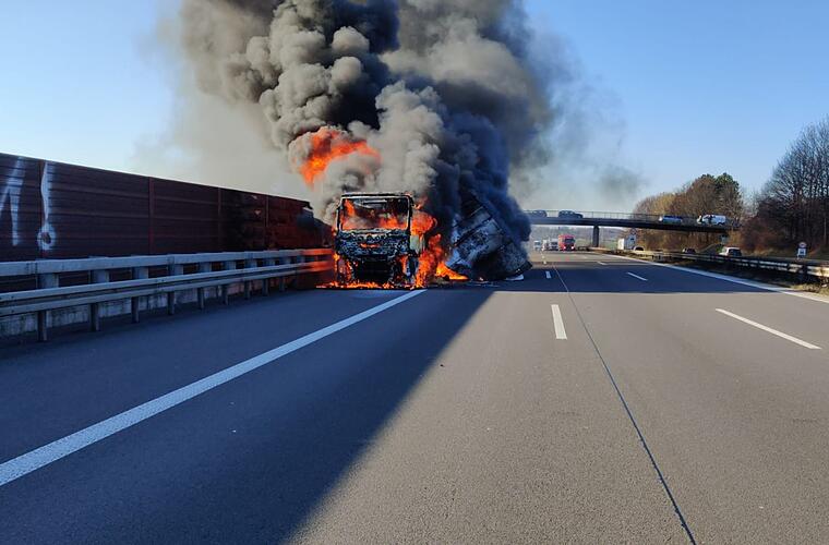 Bei dem Fahrzeug platzte den Polizeiangaben zufolge während der Fahrt der vordere, linke Reifen. Dem Fahrer gelang es noch, seinen Sattelzug auf den Standstreifen zu lenken. Durch die Reibung entflammte jedoch der beschädigte Reifen und das Feuer griff auf das Fahrzeug über. Bis zum Eintreffen der Feuerwehr stand dieses in Vollbrand.