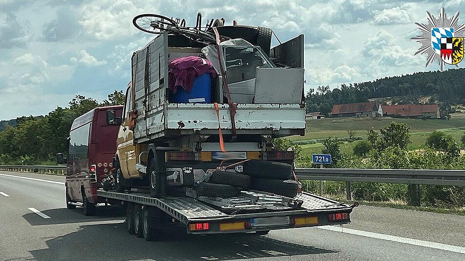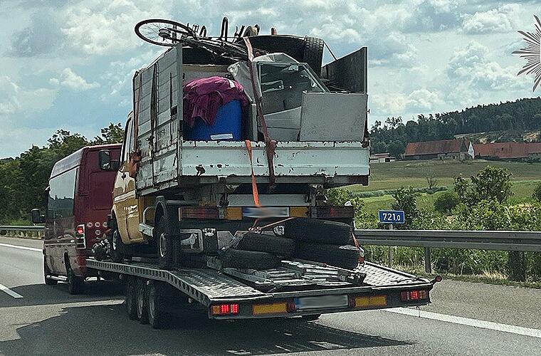 Tatsächlich hatte der Fahrer auf seinen Laster einen kompletten weiteren Transporter geladen. Dieser war voll mit Gerümpel - und als Kirsche obendrauf thronte ein Fahrrad an der Spitze des Lkw-Stapels. Gesichert war das Ganze mit einigen Bändern. Autoreifen sollten das Abrutschen des kleineren Kastenwagens von der Ladefläche verhindern.