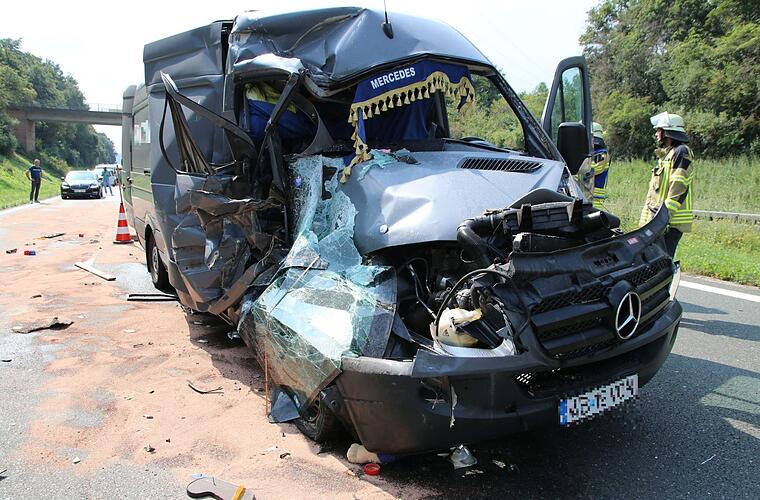 Durch die Wucht des Aufpralls war nahezu die komplette Front des Transporters eingedrückt. Der Fahrer hatte allerdings Glück im Unglück. Er konnte sich selbst aus dem Wagen befreien. Wenn jemand auf dem Beifahrer gesessen wäre, hätte er den Unfall nicht überlebt, glaubt Stefan Fischer, Kommandant der Feuerwehr Lichtenau. Die beiden Mitarbeiter der Autobahnmeisterei wurden ins Krankenhaus gebracht.