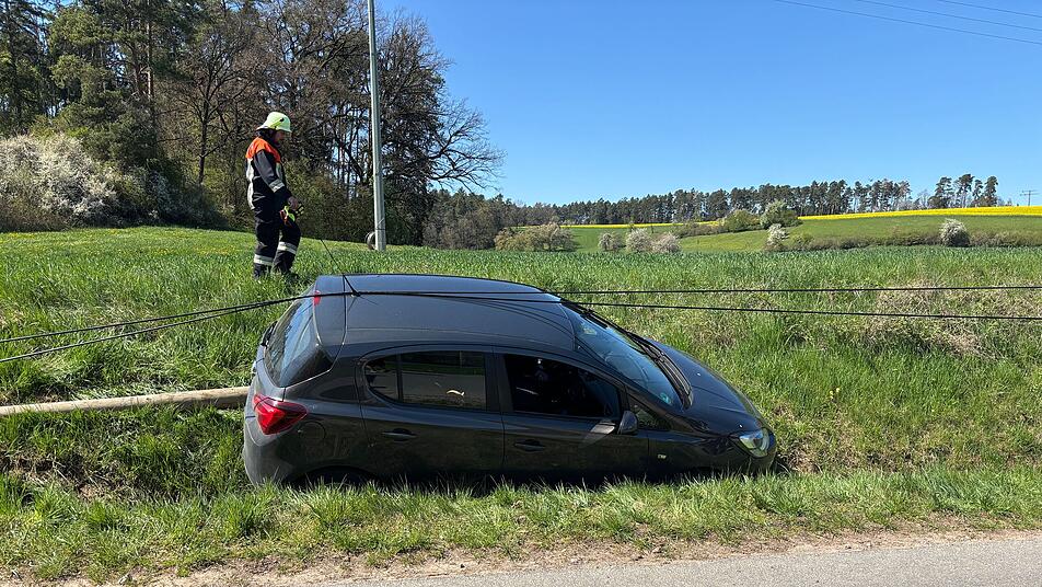 Auf einer mittelfränkischen Ortsverbindungsstraße ist eine Autofahrerin in den Graben und hat dabei einen Telekom-Mast erfasst. Dieser wurde aus der Verankerung gerissen und liegt nun neben der Fahrbahn.