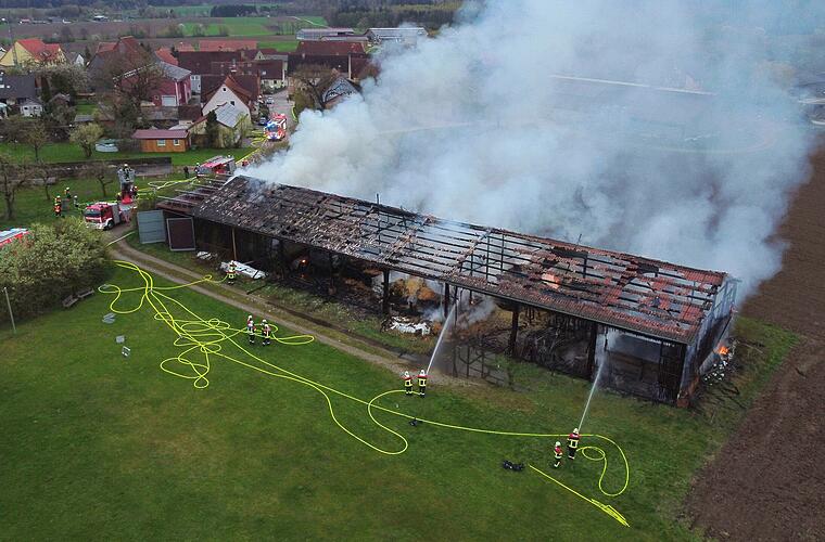 Gegen 18.30 Uhr wurde der Integrierten Leitstelle ein in Flammen stehendes Gebäude gemeldet. Als eine alarmierte Streife der Polizeiinspektion Feuchtwangen am Brandort eintraf, stand die Scheune eines landwirtschaftlichen Anwesens bereits im Vollbrand. Den Einsatzkräften der umliegenden gelang es demnach zügig, den Brand unter Kontrolle zu bringen.