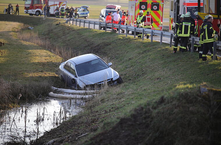 Betrunken in Wassergraben gefahren - Feuerwehr dämmt auslaufende Schadstoffe ein