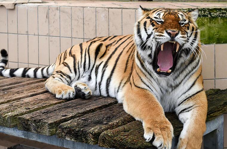 Der Tiger liegt wieder entspannt auf seinem Holzsteg. Im Gehege dahinter schleicht sein Bruder Boris am Gitter entlang, ab und an bläst er. Das sei eine Art "Hallo" in der Tigersprache, sagt Neuendorf. Er kennt seine Tiere genau. "Wenn eine Raubkatze nah an den Käfigrand kommt und den Schwanz anhebt, dann nichts wie weg." Zu neugierigen Besuchern würden die Tiger gerne mal einen Schwall Urin auf die Jacke spritzen. Heute lässt Igor die Menschen vor seinem Revier trocken davonkommen. Der Tiger gähnt und beschränkt sich aufs Beobachten. Sein Blick aus den grün-gelben Augen bohrt sich ins Gedächtnis.