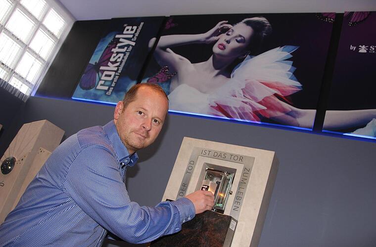Deshalb hat Hanel das Label "Rokstyle" gegründet, das sich ganz bewusst von der konservativen Branche abgrenzt. Der Name setzt sich aus "Rock", Englisch für Stein, und "Style", also Stil, zusammen. Dass das "c" im Wort Rock fehlt, ist dem Markenrecht geschuldet. "Es gibt doch in allen Lebensbereichen Marken, mit denen man sich identifizieren kann. Warum nicht auch bei Grabsteinen?" Wie in der Modeszene gibt es bei "Rokstyle" alle zwei Jahre eine neue Kollektion "und zwischendurch einzelne neue Modelle". Hand in Hand arbeitet der Steinmetz bei der Gestaltung mit langjährigen Partnern zusammen, etwa einer Kunstgießerei.
