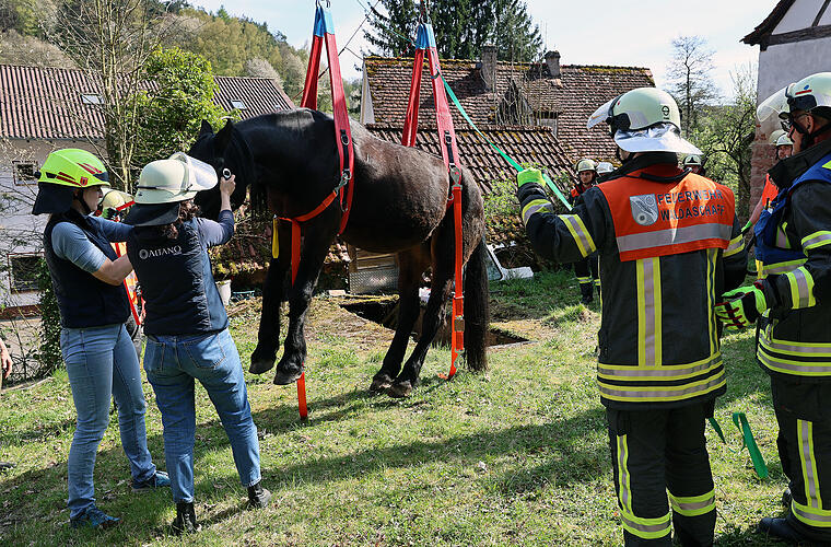 Großtierrettung im Landkreis Aschaffenburg: Ein Pferd wurde mit Kran aus einer Grube gehoben. Mehrere Feuerwehren arbeiteten zusammen.