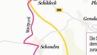 Der mittelschwere Anstieg wird einem versüßt durch den herrlichen Blick auf großräumige Wiesen, auf der rechten Seite grüßt ganz versteckt eine kleine Mariengrotte. Hier kann man erstmals eine kleine (Trink-) Pause einlegen. Nachdem man auf der Straße durch die Autobahnunterführung geradelt ist, geht es nach ungefähr 300 Metern - direkt vor dem gelben Wegweiserschild - nach Schildeck. Hier heißt es noch mal: kräftig in die Pedale treten. In Schildeck selbst wird man dann wieder mit einer weitläufigen Aussicht belohnt: die Autobahn A 7 schlängelt sich durch die Landschaft, der Blick schweift weit über Geroda und Platz hinaus.