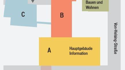 Leitsystem Das Landratsamt ist ab sofort in fünf Bereiche aufgeteilt (siehe Grafik): Bauteil A (farblich orange gekennzeichnet) ist das Haupthaus, B (rot) bezeichnet den Anbau aus den 1980er Jahren, C (blau) markiert den Erweiterungsbau in Richtung Mühlgasse und D (grau) den Großen Sitzungssaal. Baulich getrennt ist die Bauabteilung in Bauteil E (grün), dem ehemaligen Vermessungsamt untergebracht.