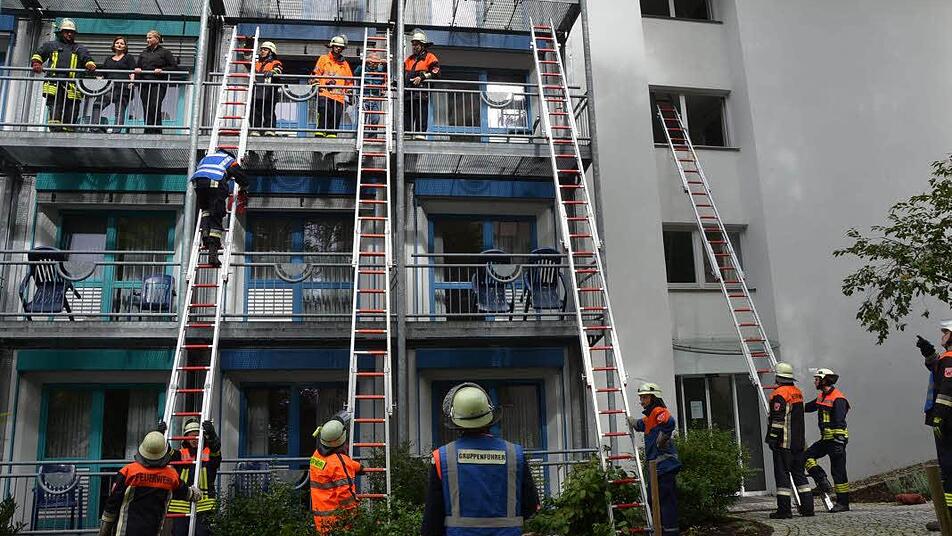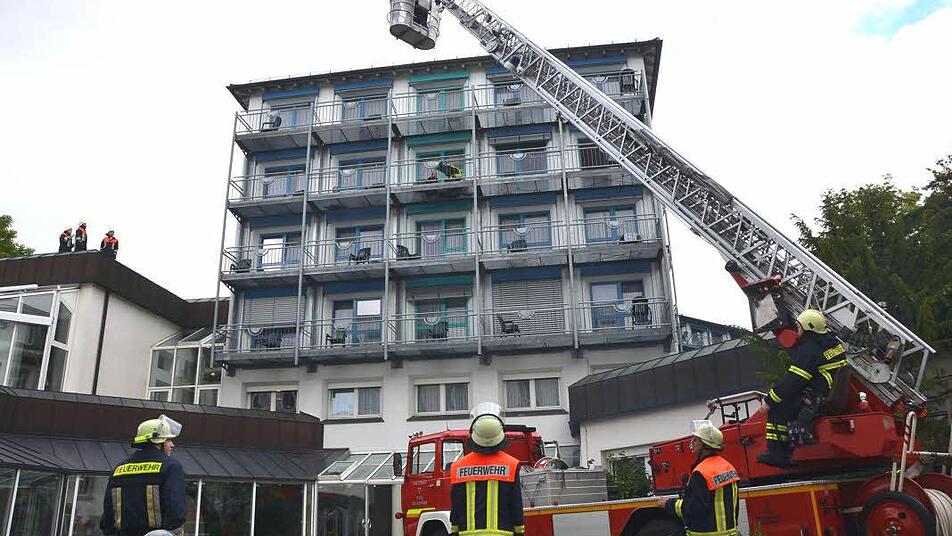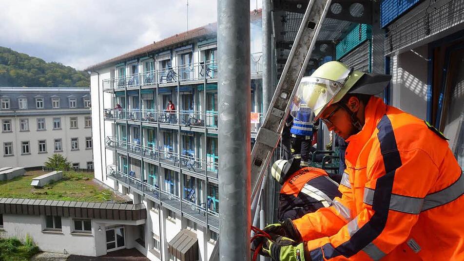 Dramatische Szenen spielten sich am Samstagnachmittag im Haus Kreuzberg der Kurklinik "Am Kurpark" in Bad Kissingen ab. Dutzende von Menschen standen an den Balkonen und vor geöffneten Fenstern und riefen, ja schrien um Hilfe. Aus etlichen Fenstern im vierten Stock drang dichter weißer Qualm - aber, wie bei der Papstwahl, weißer Rauch bedeutet Gutes und so war dieser "Brand" nur eine Übung.