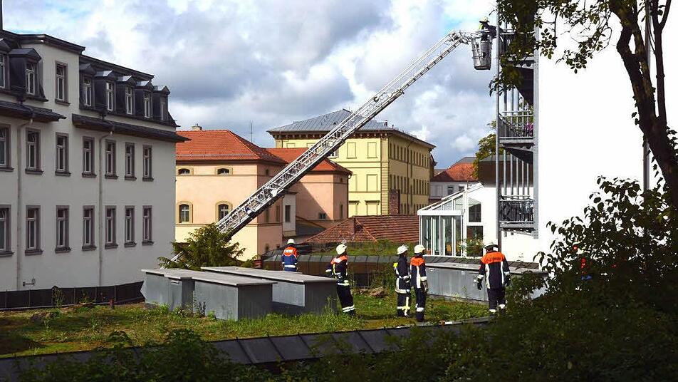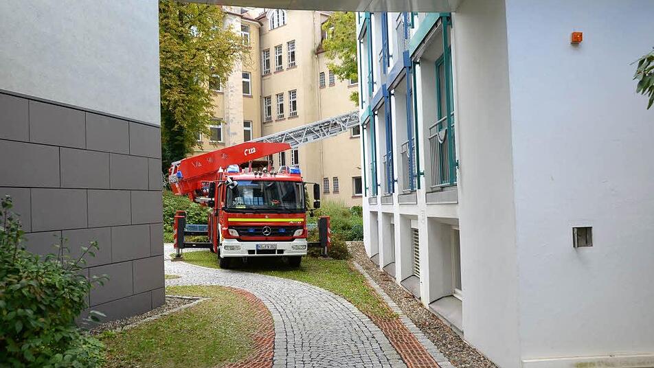 Räume, die zum parkähnlichen Innenhof gelegen sind konnten nur durch Steckleitern erreicht werden, da auch eine zwischen Haus Saaleblick und Haus Kreuzberg hindurch manövrierte Drehleiter nur die äußersten Balkone erreichte: aber, die Übungslage sah ja vor, dass etliche Patienten in