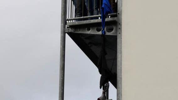 Im Treppenhaus selbst sah man die Hand vor den Augen nicht, so gut arbeiteten die insgesamt vier eingesetzten Nebelmaschinen, die einen künstlichen weißen Rauch erzeugten.