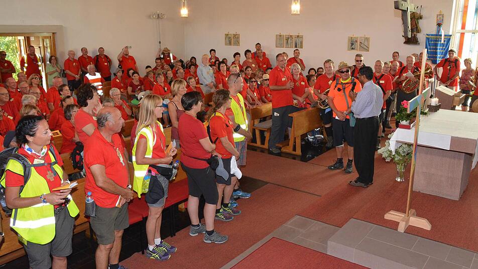 Großenbrach zuerst einmal ein Halt in der Kapelle eingelegt. Pater Raja begrüßt die Wallfahrer und spricht ein kurzes Gebet. Auch dies ist etwas Besonderes, tut er es doch in seiner Landessprache. Man nimmt sich noch einmal an den Händen, um die glückliche Ankunft hier zu feiern, dann geht es rasch weiter zum Feuerwehrhaus.