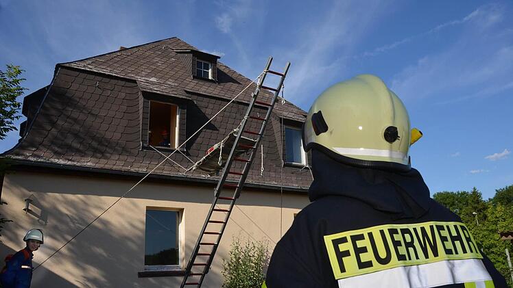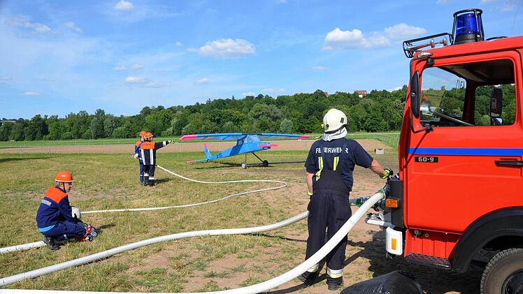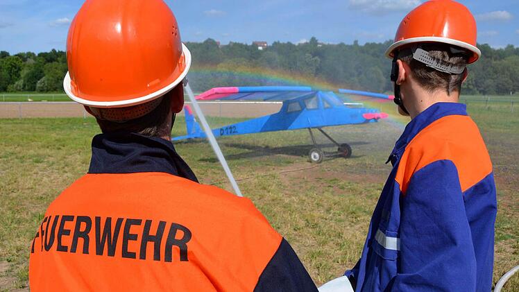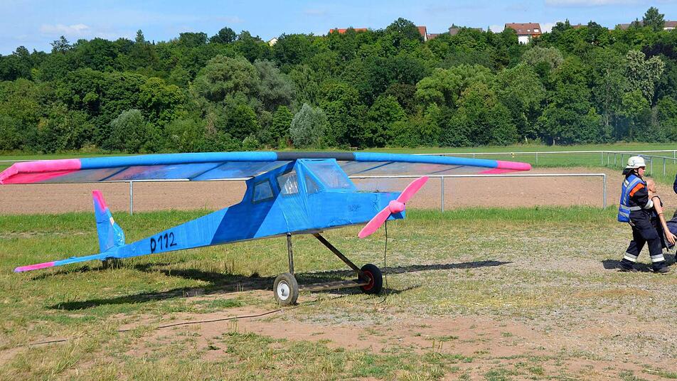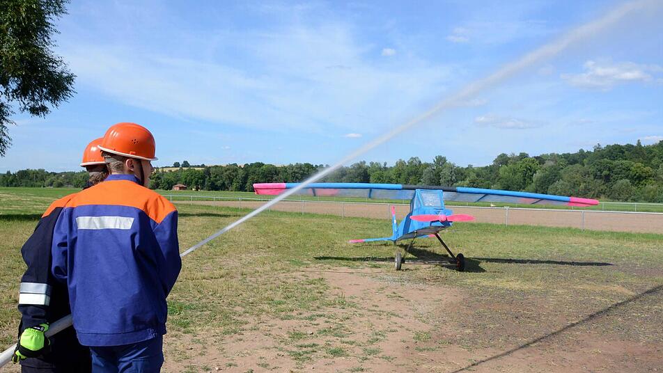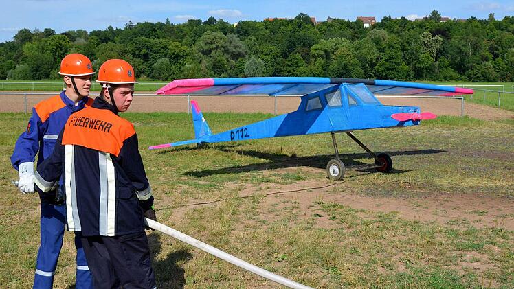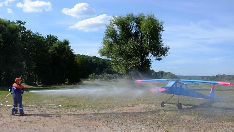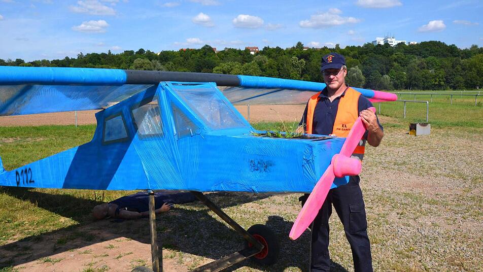 Bereits vorher geschwitzt hatte der Kommandant der Garitzer Wehr Ralf Schubert: In seinen 45-minütigen Mittagspausen baute er über eine ganze Woche an einem Motorflugzeug, das in der Au übungshalber eine "Notlandung" hingelegt hatte.