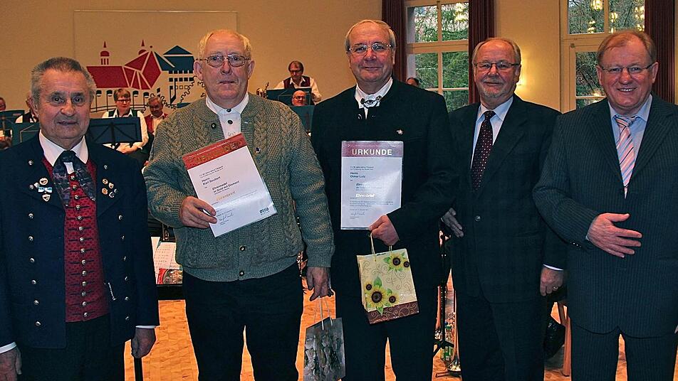 Lutz erhielt jetzt für 50 Jahre aktives Musizieren Urkunde und Ehrennadel aus den Händen von Werner Höhn, Vizepräsident des Nordbayerischen Musikbundes (NBMB). Geehrt wurde auch Tenorhornspieler Karl Seubert aus Zellingen für 60 Jahre Musizieren. "Solch eine Auszeichnung ist zugleich ein Kompliment für alle Blasmusiker in unserem Orchester", wies Lutz darauf hin, dass es eine große Ehre ist, in dieser Runde mitzuspielen.