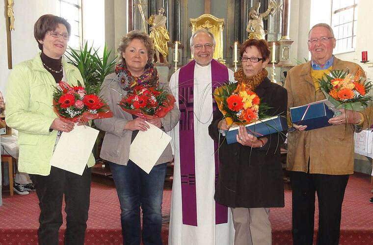 In herzlichen Worten hat Pfarrer Edwin Ziegler in Poppenroth "80 Jahre Pfarrgemeinderat" verabschiedet. 40 Jahre war Wolfgang Wimmel im Gremium vertreten, davon 24 Jahre als stellvertretender Vorsitzender. Er kümmerte sich um die Öffentlichkeitsarbeit und gestaltete den Pfarrbrief, was er auch noch weiterhin übernehmen wird. Christa Goll war 16 Jahre im Pfarrgemeinderat vertreten und übernahm in den letzten acht Jahren den Vorsitz. In den 12 Jahren ihrer Zugehörigkeit kümmerte sich Karin Wehner um caritativen Aufgaben und organisierte die Caritas-Sammlungen. Helga Schäfer war ebenfalls 12 Jahre dabei und brachte sich als Lektorin und Kommunionspenderin ein.