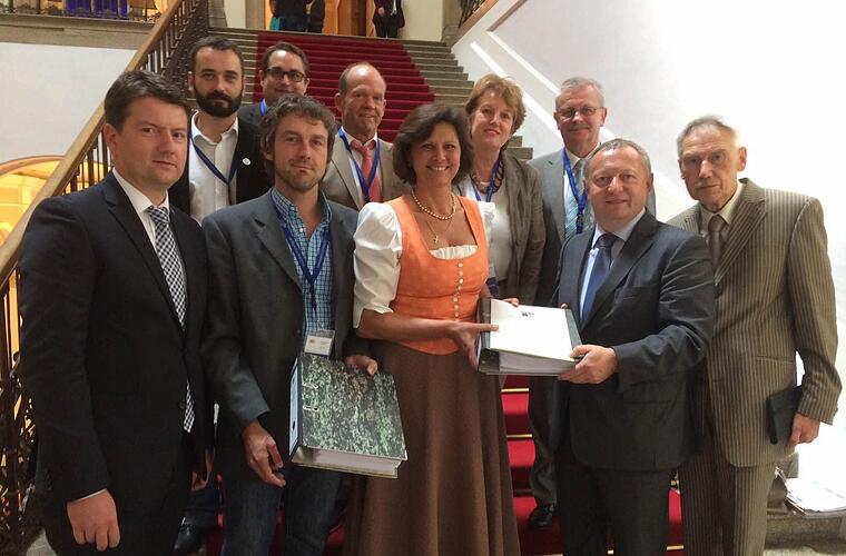 Vertreter aus dem Kreis Bad Kissingen übergeben die Unterschriften gegen die geplante Stromtrasse an Ministerin Ilse Aigner.