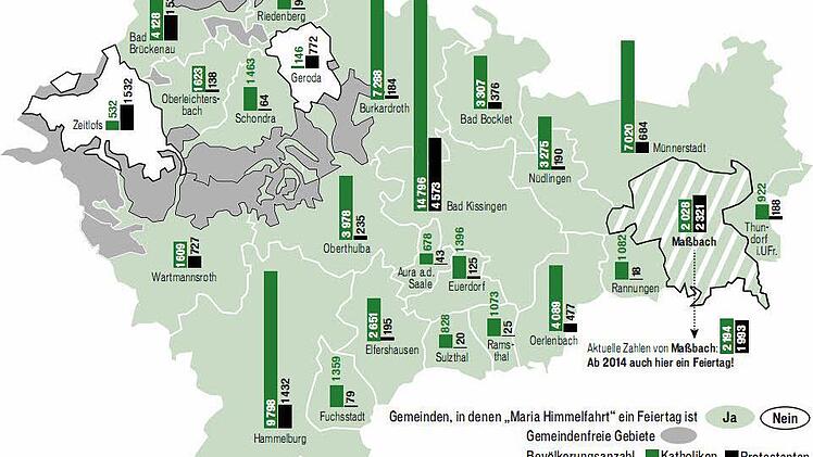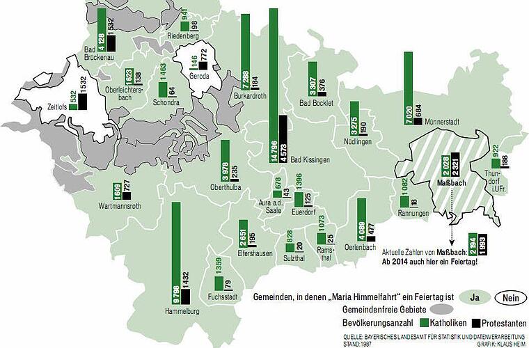 Heuer entscheiden zum letzten Mal die Daten der Volkszählung 1987 darüber, wo Geschäfte geöffnet sein dürfen oder Arbeitnehmer frei haben. Nur in Gemeinden, in denen damals die Zahl der Katholiken höher war, ist in Bayern der 15. August gesetzlicher Feiertag. Im Landkreis Bad Kissingen sind das (noch) drei Gemeinden: Zeitlofs, Geroda und Maßbach (siehe Grafik). Insgesamt können sich in Bayern die Menschen in 1700 von 2056 Kommunen über einen Feiertag am 15. August freuen. Wie das 2014 sein wird, ist nicht zentral erfasst: Die Ergebnisse des Mikro-Zensus 2011 sind noch nicht endgültig aufgearbeitet.