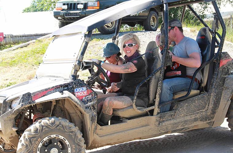 Moni schiebt sich das schwarze Halstuch über Nase und Mund und drückt mit ihrem schweren Stiefel das Gaspedal durch. An Bord: Jean-Pierre und Heidi Greminger. Mit ihrem kleinen Offroad-Quad heizt sie den Hügel hinauf und weg sind die Drei. "Man darf sich nicht verkrampfen", sagt Heidi Greminger nach der Runde auf der Piste, "dann macht es Spaß." Mit ihrem Mann ist sie extra aus der Nähe von Zürich angereist.