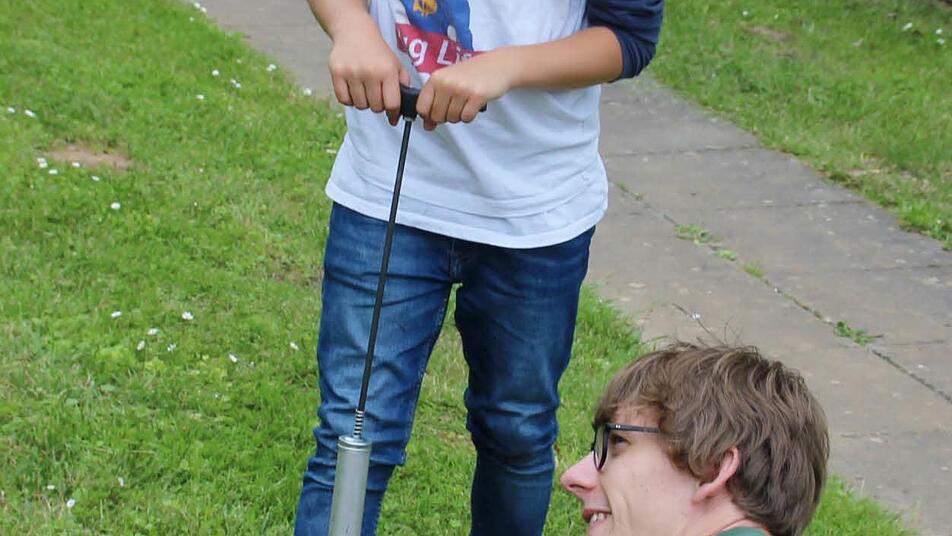 leider ab. Man sah die Ehrengäste dann später zusammen mit MdL Sandro Kirchner, Kurdirektor Frank Oette und Heiligenhof-Geschäftsführer Steffen Hörtler beim "Smalltalk mit Gulasch". Sie beobachten, wie der zehnjährige Cedric an der Homo-Pfiffikus-Station zum Erforscher von Naturgesetzen wird. Er pumpt solange Luft in eine halb mit Wasser gefüllte Plastikflasche, bis das Geschoß durch den Überdruck bis zu 20 Meter weit fliegt.