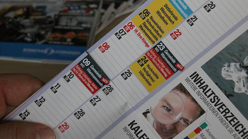 Den 32-seitigen Abfuhrkalender gibt es in 13 Versionen, ein Teil der 25 Kommunen wurde zusammengefasst. Insgesamt enthalten die Kalender mehr als 7000 Einzeltermine. Verschiebungen gibt es vor allem in Hammelburg, Wartmannsroth und Oberthulba. Mit anderen Landkreisen hat das KU zudem den Film "Ein Jahr ohne Müllabfuhr" erstellen lassen, der die Arbeit der Entsorgungsbetriebe und Abfallberater erläutert. Film und Abfuhrkalender gibt es unter