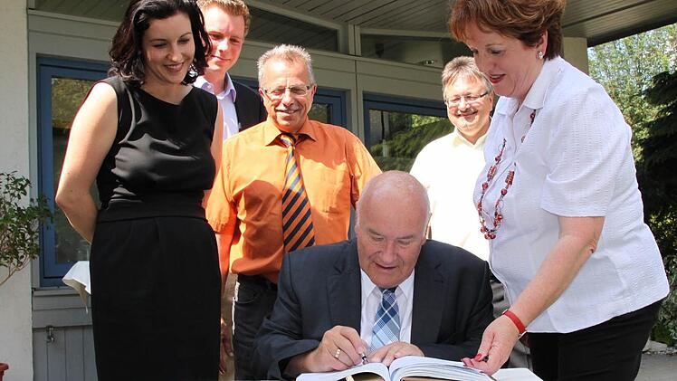 In der Georgi-Kurhalle trägt sich Hinsken ins Goldene Buch der Stadt ein.