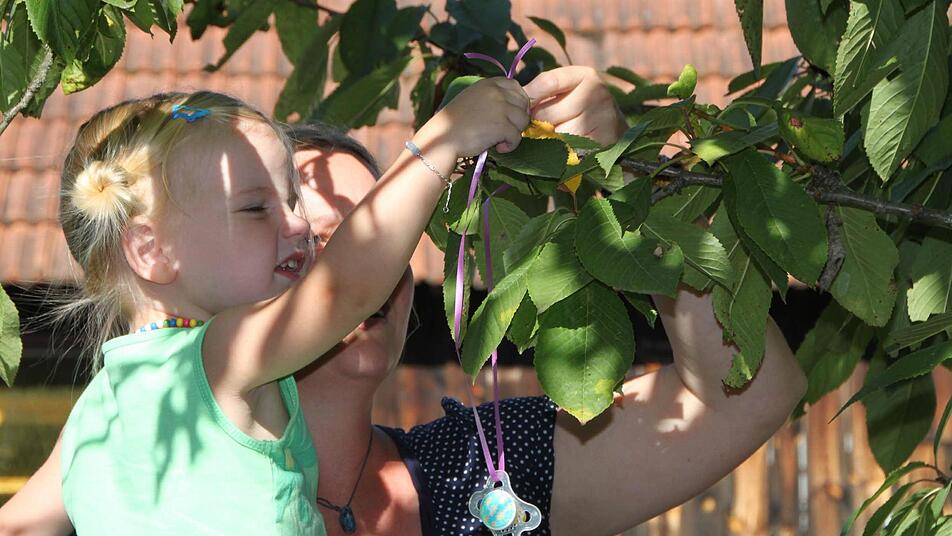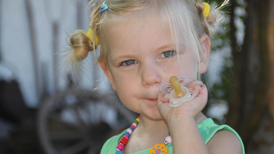 Marketing-Aktion von "Nuk" Frieda zieht zwei Schnuller aus der Tasche. Ihre Zunge fährt konzentriert über ihre Lippen. Der eine ist grün, der andere weiß. "Warum wollen wir die Schnuller abgeben?", fragt ihre Mutter Bettina Schlereth aus Oehrberg. "Da werden die Zähne krumm", sagt Frieda noch etwas zögerlich. Dann guckt sie kritisch nach oben in den Kirschbaum.