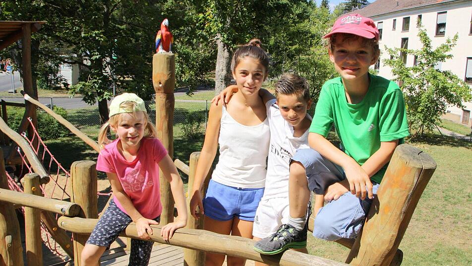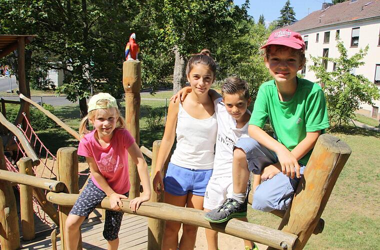 Das Klettergerüst in Form eines Piratenschiffes hat unseren Testern (von links) Elisabeth, Giulia, David und Johann auf dem Spielplatz der Henneberg-Siedlung besonders gefallen. Foto: Ralf Ruppert