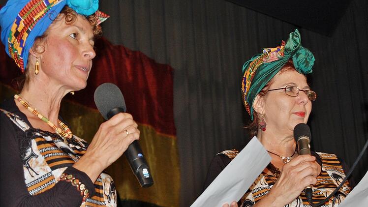In afrikanischer Tracht gekleidet, erzählte sie auf der Bühne im Wechsel mit Madlen Maurin in Versform von ihrem Privatbesuch in Afrika.