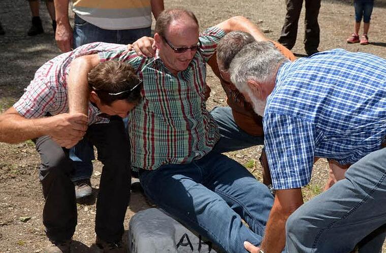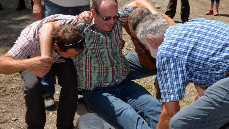 Darum wird gestaucht Die Führung mit Erläuterung liegt in Händen von Günther Wolf. Ihm obliegt es zudem, gemeinsam mit seinen drei weiteren Feldgeschworenen Robert Halbig, Walter Schmitt und Dietmar Schlereth den mitlaufenden Stadtrat Walter Schuhmann zu stauchen. Das bedeutet, dass der Delinquent mehr oder minder hart von den vieren auf den Dreimärker gesetzt wird, damit er nie mehr die Lage eben dieses so wichtigen Grenzsteines vergisst.