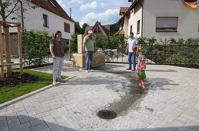Spielcharakter hat der dritte Brunnen hinter dem Kreuz. Der Überlauf fließt nach unten in einen kleinen Wasserlauf ab. Das verlockt natürlich zum Spielen. Die dreijährige Laney Gridley kann nicht genug bekommen. Wenn Opa-Tag ist, dann muss Hermann Endres mit seiner Enkelin speziell zu diesem Brunnen. Mit der Gießkanne versorgt sie nicht nur die Blumen und Bäume im Umfeld sondern auch die Füße von ihrem Opa und ihre eigenen. "Das ist schon eine tolle Sache mit den Brunnen. Wir besuchen alle regelmäßig alle vier", lacht Endres. Denn außer den drei Brunnen in der Salzforststraße gibt es noch den vierten Brunnen bei Roman Fuchs, den er vor nicht allzu langer Zeit erneuerte.