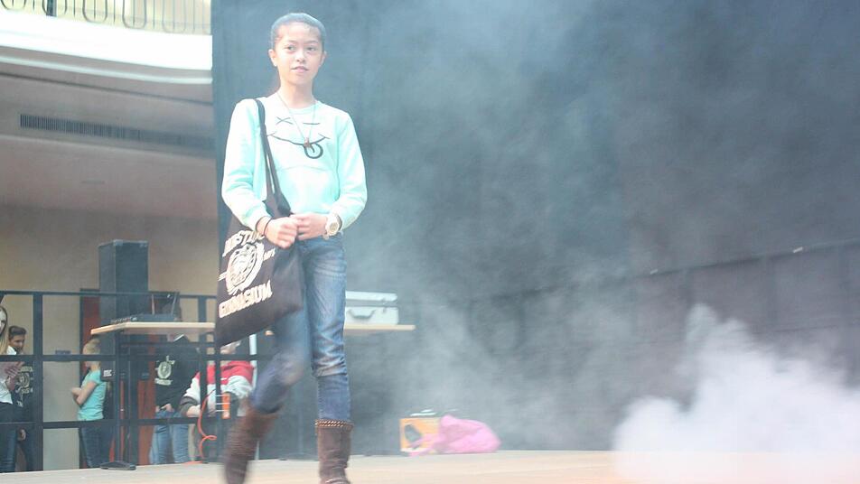Qualm steigt aus der Nebelmaschine, bunte Lichter scheinen von der Decke und laute Musik dröhnt aus den Boxen. Am Jack Steinberger Gymnasium findet eine Modenschau statt. Präsentiert wird ein brandneues Schullogo und die dazugehörige Kollektion. "Man erkennt erst auf den zweiten Blick, dass es sich um Schulkleidung handelt", sagt Ivane Antonov, Schüler der Klasse 12 und Moderator der Modenschau. Die Kleidung könnten die Schüler also auch im Alltag tragen.