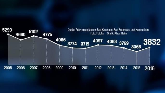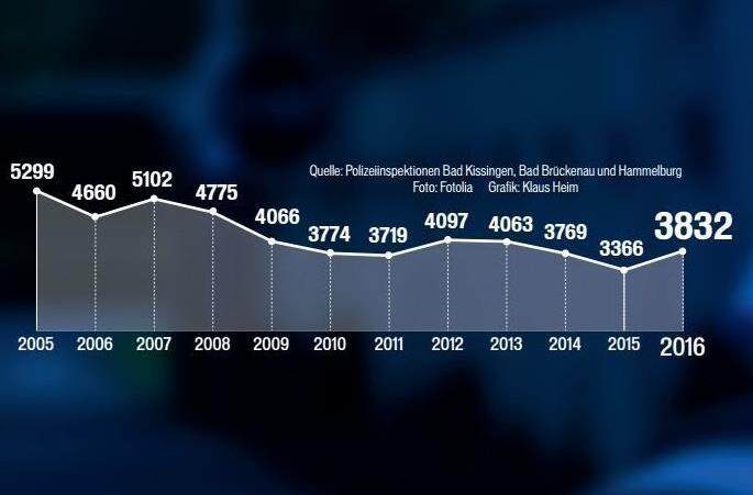 Große Unterschiede gibt es im Landkreis bei der Zahl der Straftaten im Verhältnis zur Bevölkerung: Im Raum Hammelburg gab es, statistisch gesehen, im Jahr 2016 nur 2705 Straftaten je 100 000 Einwohner, dagegen waren es im Norden des Landkreises, also im Zuständigkeitsbereich der PI Bad Brückenau, mehr als doppelt so viel: 4500 betrug dort die so genannte Häufigkeitszahl. Die PI Bad Kissingen liegt mit 3925 Delikten pro 100 000 Einwohner knapp darunter, allerdings ist die regionale Verteilung innerhalb des Dienstbereiches sehr unterschiedlich: Die Stadt Bad Kissingen ist mit einer Häufigkeitszahl von 6711 absoluter Spitzenreiter: 1456 der 2238 Fälle, also rund zwei Drittel, entfielen auf die Große Kreisstadt. Zum Vergleich: In Münnerstadt liegt die Häufigkeitszahl bei 3579, in Burkardroth nur bei 1334, am sichersten lebt man statistisch gesehen in Rannungen mit 1163 Straftaten auf 100 000 Einwohner. Absolut waren es 14 Straftaten im Jahr 2016.