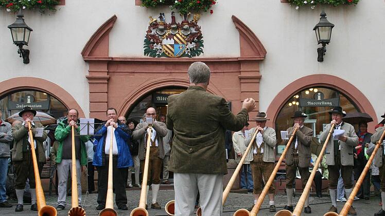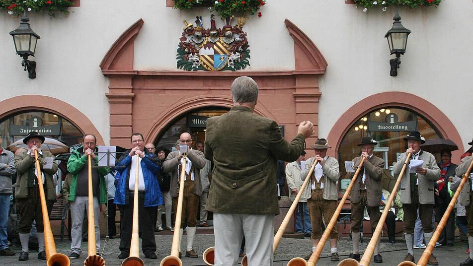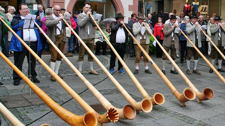 Mitglieder der Seniorenorchester sorgten für sonore Alphorn-Klänge auf dem Marktplatz vor dem Alten Rathaus in Bad Kissingen. Mehrstimmige Weisen begeistern die Zuhörer.