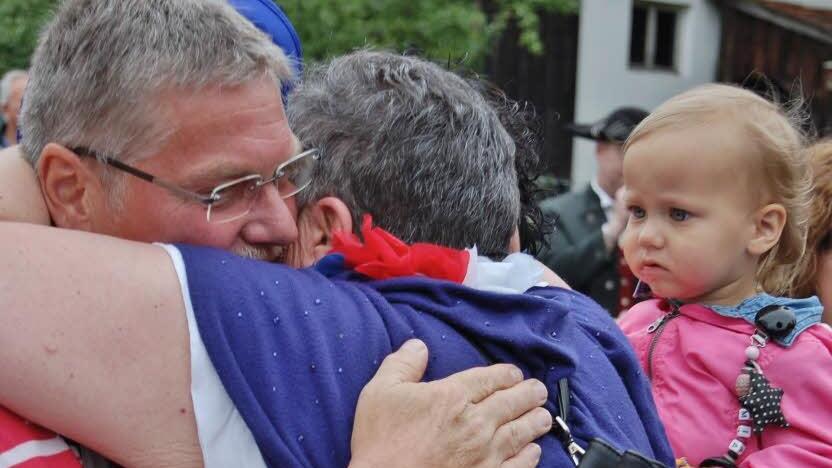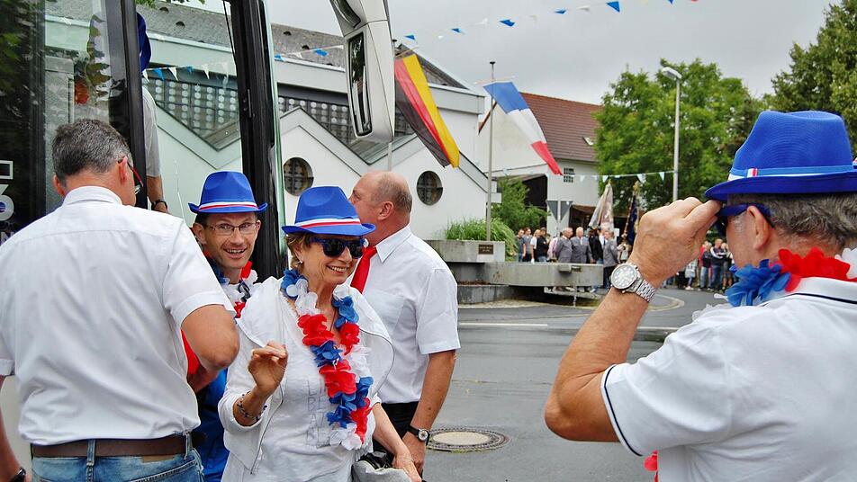 pünktlich um 18 Uhr hörte der Nieselregen auf, als der französische Bus mit seinen 43 Gästen im Alter zwischen 18 und 73 Jahren hupend um die Ecke bog. Fröhlich winkten die in ihren Nationalfarben Blau, Weiß und Rot gekleideten Fahrgäste den wartenden Gastgebern zu.