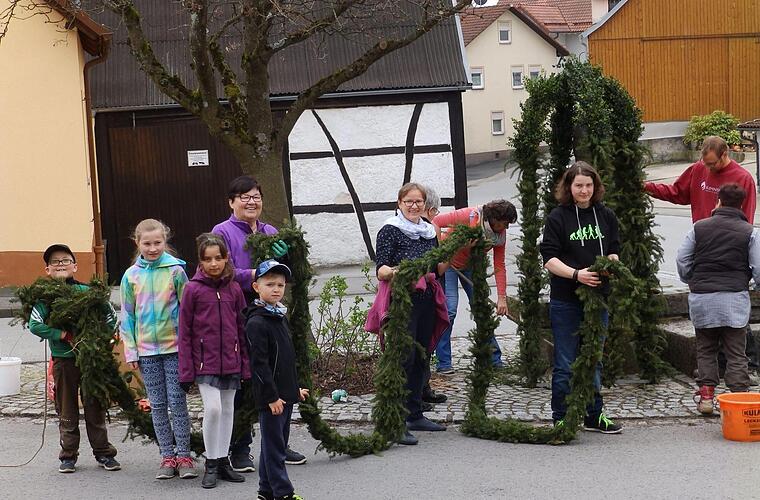 Zum Schmücken des Dorfbrunnens haben sich 20 Ortsbürger in Stangenroth getroffen. Mit vereinten Kräften wurde die Buchskrone angefertigt.