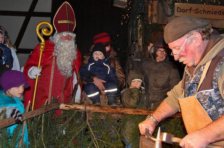 Eine Attraktion für die Jüngsten dürfte der Dorfschmied aus Wollbach (unser Foto) sein, der vor den Augen der Besucher Eisen bearbeitet. Zwischen 14 und 15 Uhr wird der Nikolaus wiederkommen. Die Aschacher Schlossweihnacht wird auch am nächsten Adventswochenende vom 13. bis 15. Dezember wieder geöffnet.
