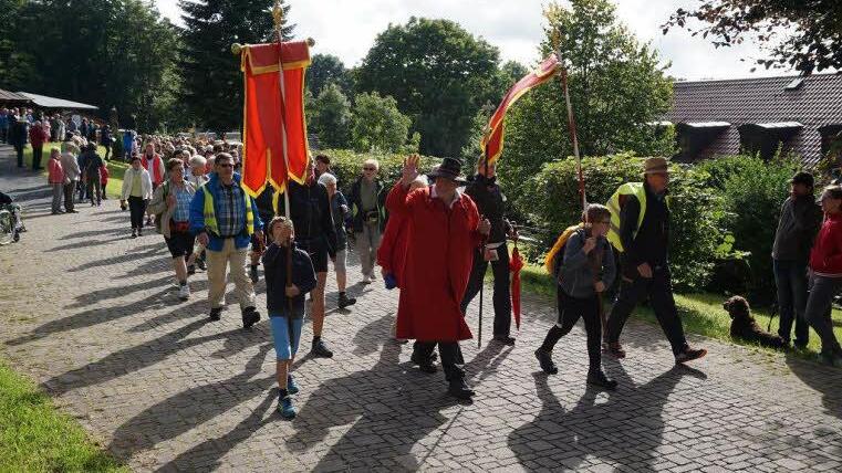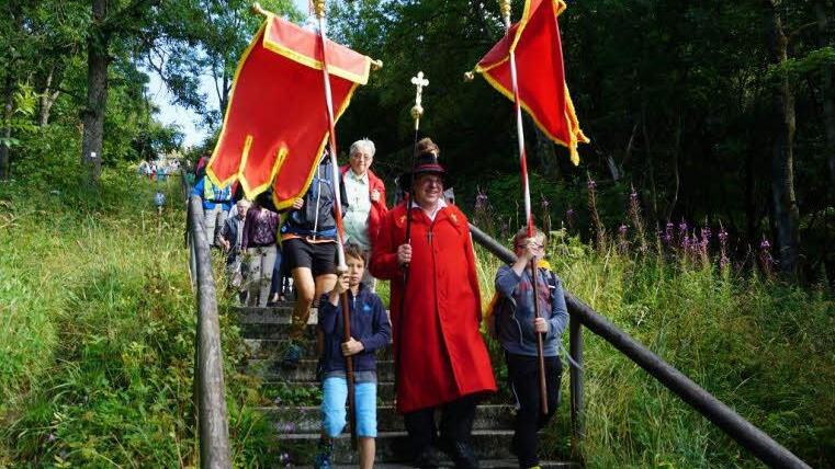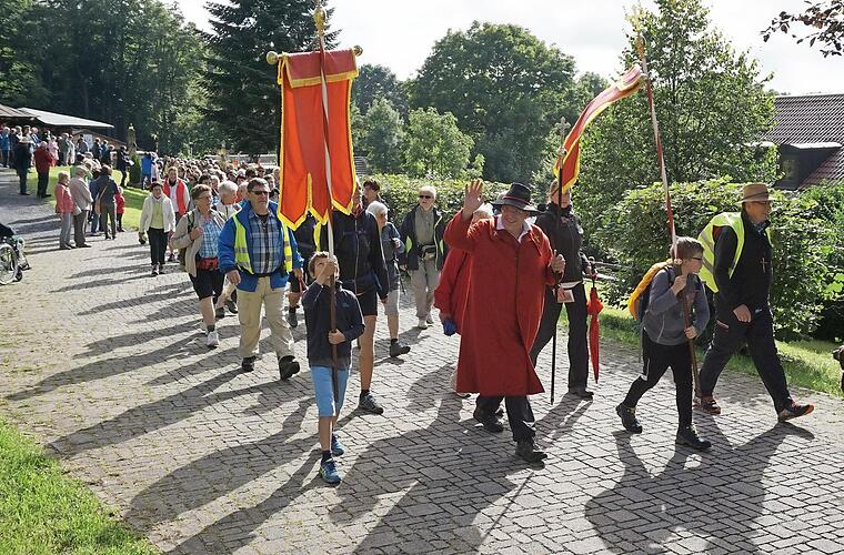 Dann endlich war es soweit. Auch wenn vereinzelt schon Wallfahrer nach unten gingen, erst als das Kreuz, die Fahnen und der weithin leuchtend rote Mantel von Pilgerführer Klaus Rindt auftauchten, begann der Abstieg der Wallfahrer. Es ist Jahr für Jahr ein beeindruckendes Bild. Eine schier unüberschaubare Menge an Wallfahrern strömt nach unten.