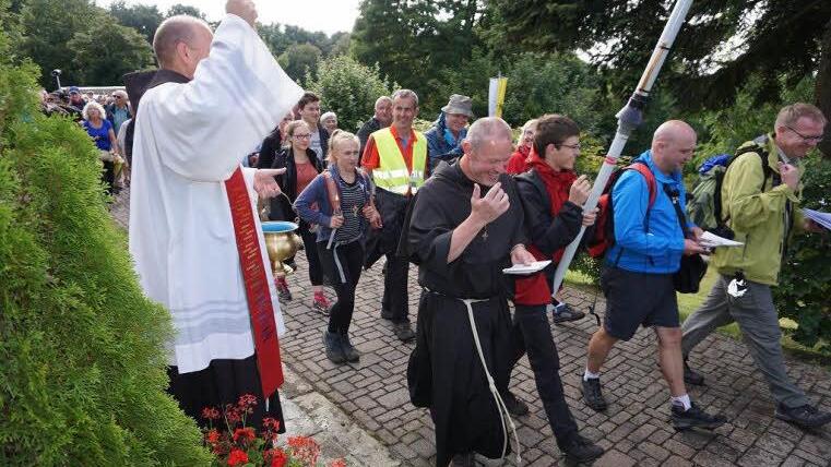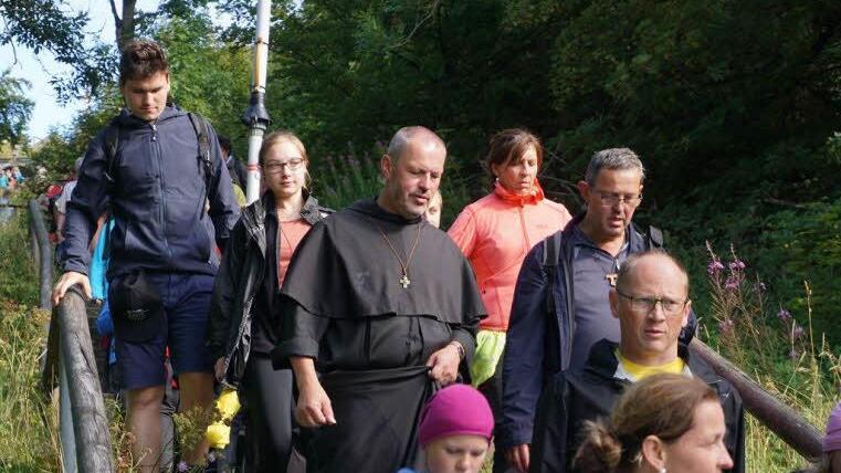Doch zunächst gab es eine tüchtige Portion Weihwasser vom Guardian des Klosters Kreuzberg, Pater Stanislaus Wentowski. "Mir tut der Arm richtig weh", gab er zu, nachdem die 550 Wallfahrer auf dem Vorplatz der Klosterkirche zusammengekommen waren. Pater Stanislaus erinnerte an die vielen Wallfahrer, die in all den zurückliegenden Jahrhunderten bereits zum Kreuzberg gekommen waren, um zu beten, innezuhalten, Gott zu danken und um seinen Segen zu bitten. "Nun stehen auch wir vor dem Kreuz", sagte er.