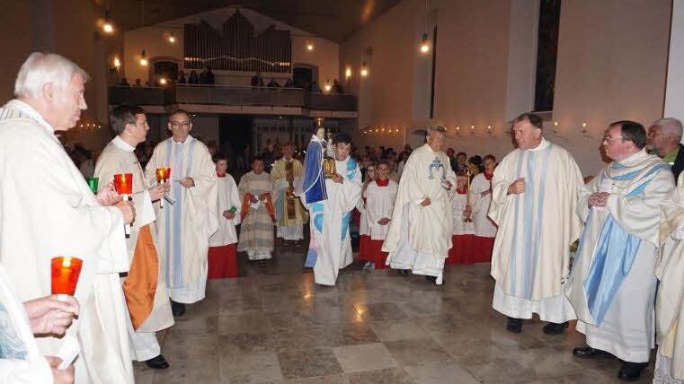 Die Gläubigen wollten mit dabei sein, wenn die Madonna in einer Lichterprozesssion aus dem Inneren der Wallfahrtskirche zum Freialtar getragen wird.