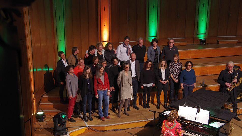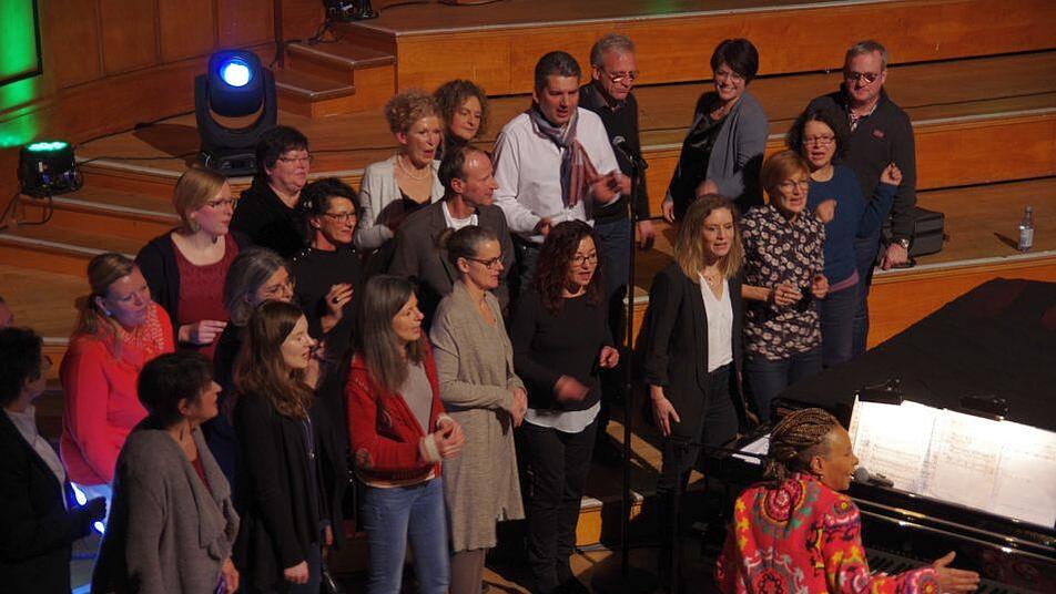 Das Ende des Konzerts feierte Jocelyn B. Smith mit 20 Personen aus dem Publikum, die sich nicht lange bitten ließen. Sie platzierten sich als swingender Chor rund um das Klavier und sangen gemeinsam den Gospel "I dont mind waiting". Rockiges im Party-Rhythmus präsentierte die neue Bühnengemeinschaft mit "When rose up this morning" und der sich anschließende frenetische Applaus animierte zu zwei Zugaben: Acapella erklang "When I need you" und danach verabschiedete sich Jocelyn B. Smith mit einem stimmgewaltigen "As above so below" und den Worten: "I wish you love. I wish you peace. I wish Germany understanding."