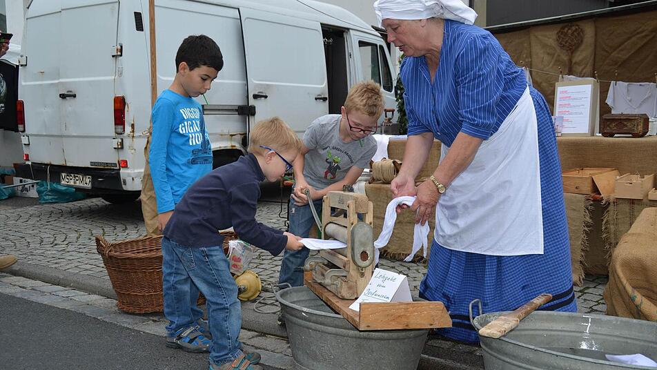 Die Jungen probierten mit Begeisterung aus, Wäsche durch eine Mangel zu leiern, um sie aufzuhängen. "Wir sind heute das erste Mal auf dem Markt in Burkardroth. Das ist unser Sonntagsausflug", erklärt ihre Mutter Daniela Wittek. Sie findet es spannend, was geboten wird. "Später werden wir hier auch noch etwas Schönes essen und vielleicht das eine oder andere Mitbringsel mitnehmen."