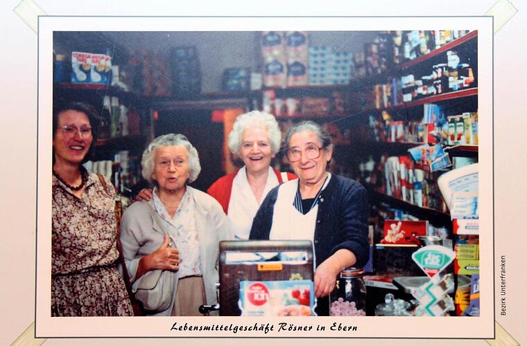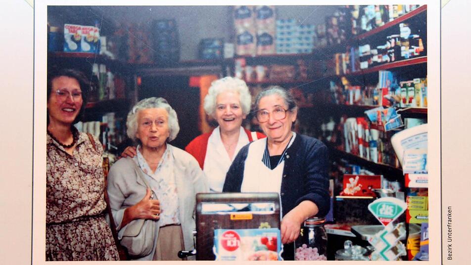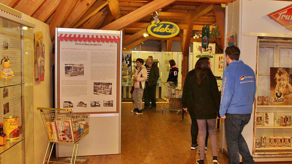 Die Wanderausstellung des Bezirks Unterfranken hält Einkaufen in der Nachkriegszeit fest, als im umgebauten Wohnzimmer der "Schumanns Thres" Salz mit der kleinen Schaufel aus dem Holzschubkasten in die braune Dreieckstüte gefüllt und auf der Bizerba-Waage abgewogen wurde. Gurken wurden einzeln mit der Holzzange aus dem "Stücht" gefischt und in gefettetes Papier gewickelt. Das Holzfass mit Heringen stand im Keller. Die Läden waren oft nur vormittags geöffnet. Nachmittags war man Bauer oder handelte mit Kohlen. Erst ab 5 Uhr nachmittags, wenn die Bauern vom Feld zurück waren, stand man wieder im Geschäft.