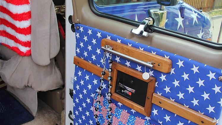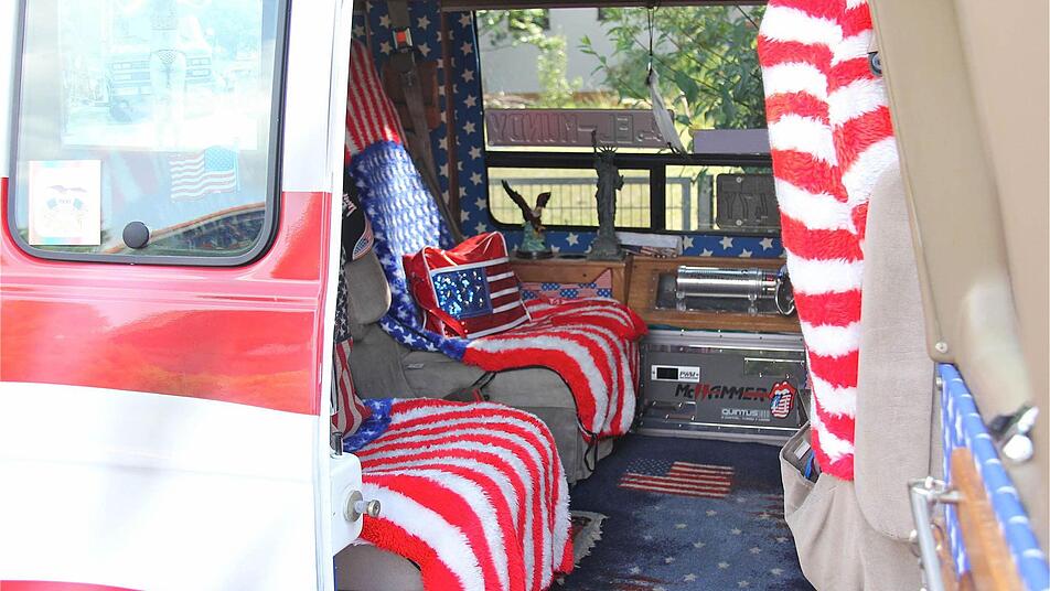 "Dieser Van ist ein Stück meines Lebens", verrät Reimer. Wie ein roter Faden zieht sich das Thema U.S.A. auch durch das Wageninnere. Die Farben der amerikanischen Freiheitsflagge "Stars and Stripes" und die Adlermotive finden sich in allen liebevoll arrangierten Details wieder. So zum Beispiel auf den selbst gefertigten Sitzbezügen, auf den Türverkleidungen bis hin zum Fußbodenbelag.