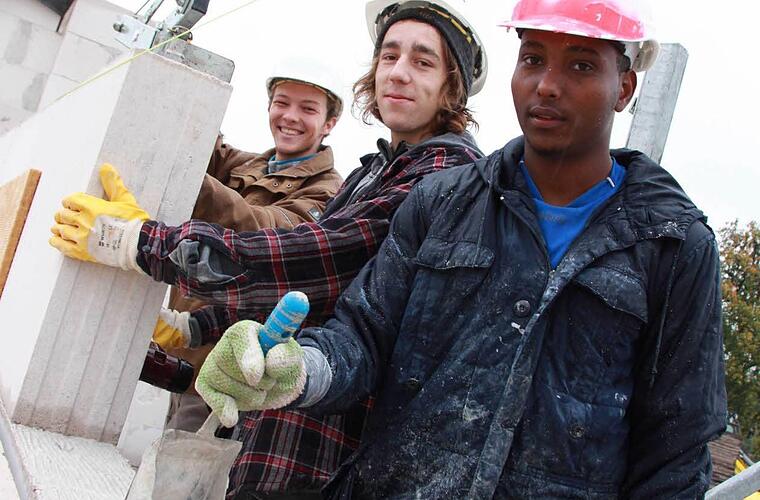 Mohammed kratzt den Mörtel auf die Bahn. Julian und Kevin rücken den nächsten grauen Klotz zurecht. Stein auf Stein. Wo sich heute Pfützen bilden, sollen bald Küchenzeile, Sofa und Kinderbett stehen. In eineinhalb Monaten will der Bauherr Richtfest feiern. Das Team liegt gut im Zeitplan. Noch: Die Hälfte der Baustellen-Mannschaft hat noch nie einen Stein auf den anderen gesetzt.