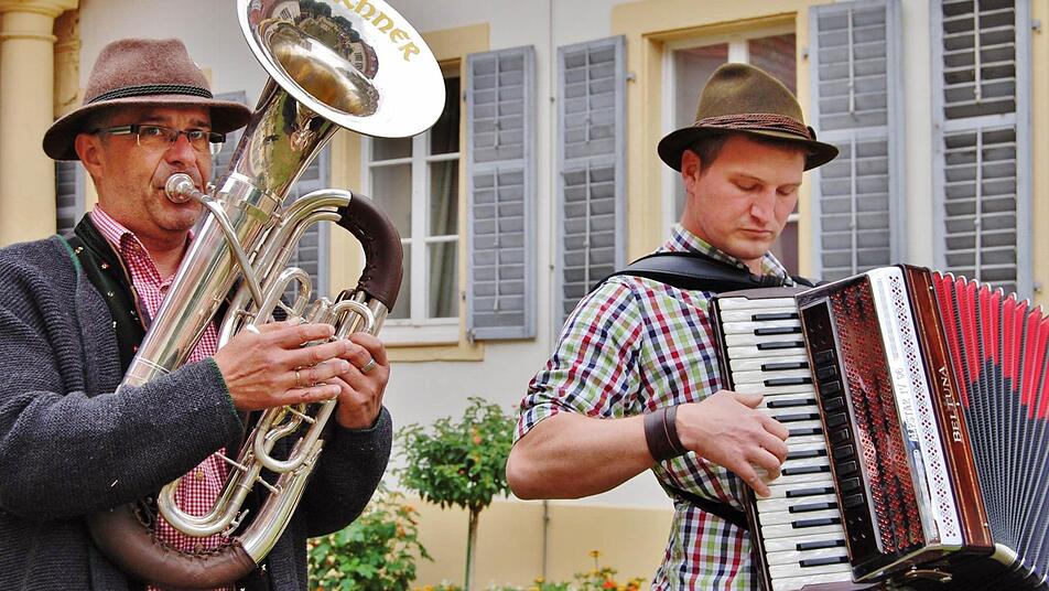Vereint spielten Musiker der Blaskapelle Bad Bocklet, der Blaskapelle Aschach und der Steinacher Musikanten fränkische Weisen. Aus Steinach war Frank Schmitt mit seinem Kollegen Joachim Bühner gekommen, Musiker der Gruppe Spilk. Ein Rhönschaf mit seinen Lämmern blökte ein paar O-Töne ins Mikrofon von Franziska Hainz, obwohl es in Bad Bocklet gar keine Rhönschafe gibt, wie Schäfer