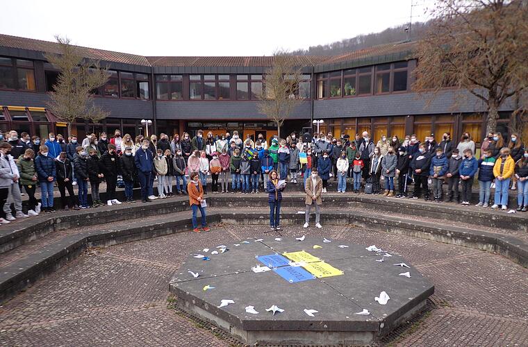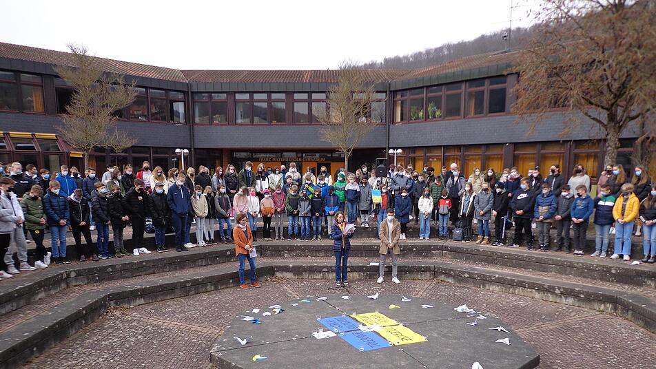 Das Franz-Miltenberger-Gymnasium setzte am Donnerstag ein Zeichen für den Frieden. Schüler wie Lehrer solidarisierten sich mit der Ukraine und gedachten der Opfer.