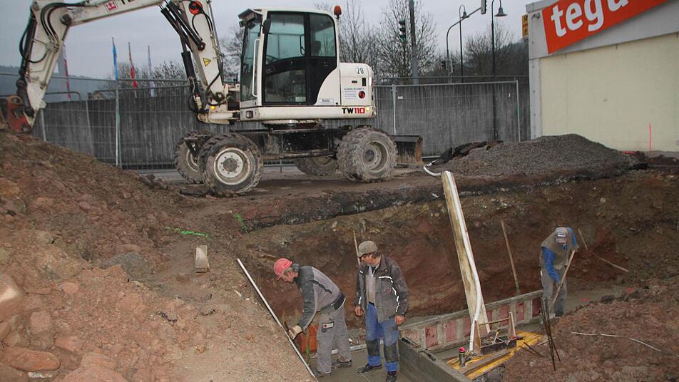 Die Feinheiten fehlen halt noch", sagt der Polier der Firma Alban Schmitt aus Hohenroth. Etwa acht Wochen hat es gedauert, die Bodenplatte Stück für Stück zu gießen. Die für den Winter eigentlich viel zu milden Temperaturen - für die Bauleute kommt es gerade gelegen. Hier und da wird noch gemauert und hinter dem Gebäude machen sich die Bauarbeiter in einer Grube zu schaffen.