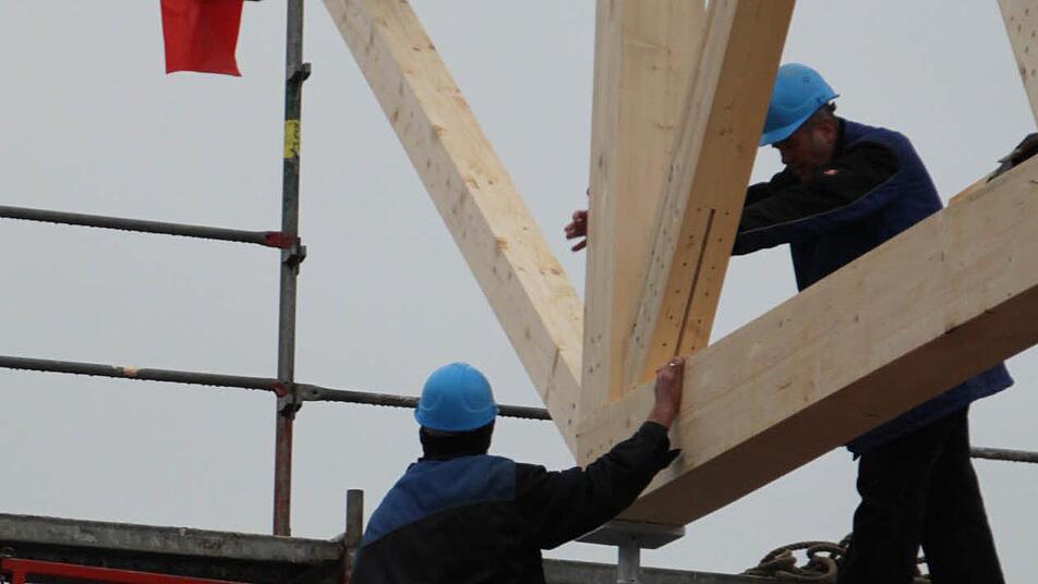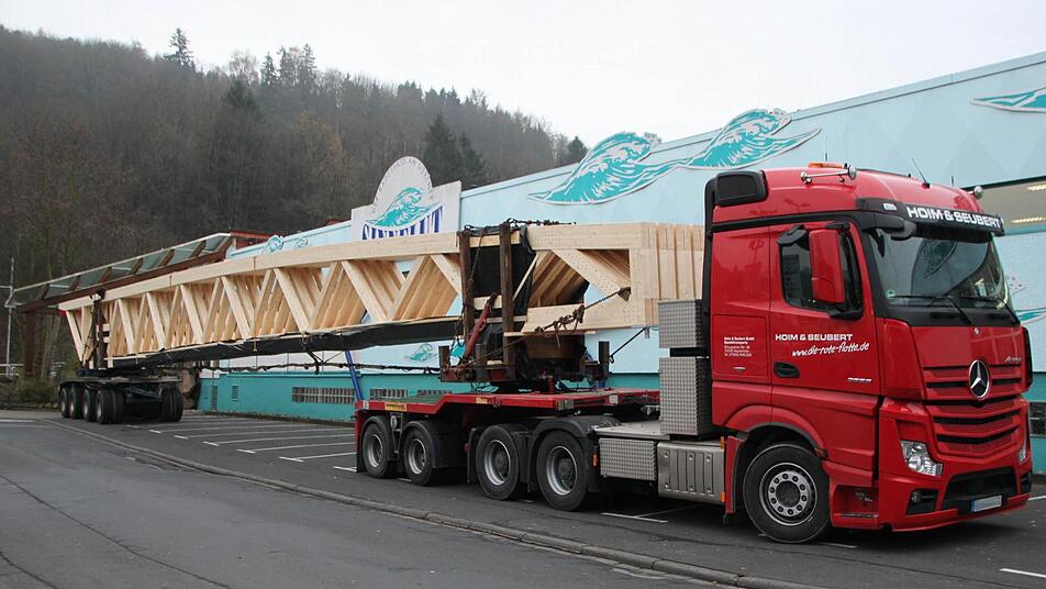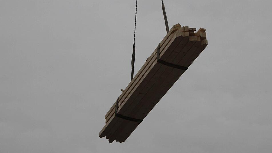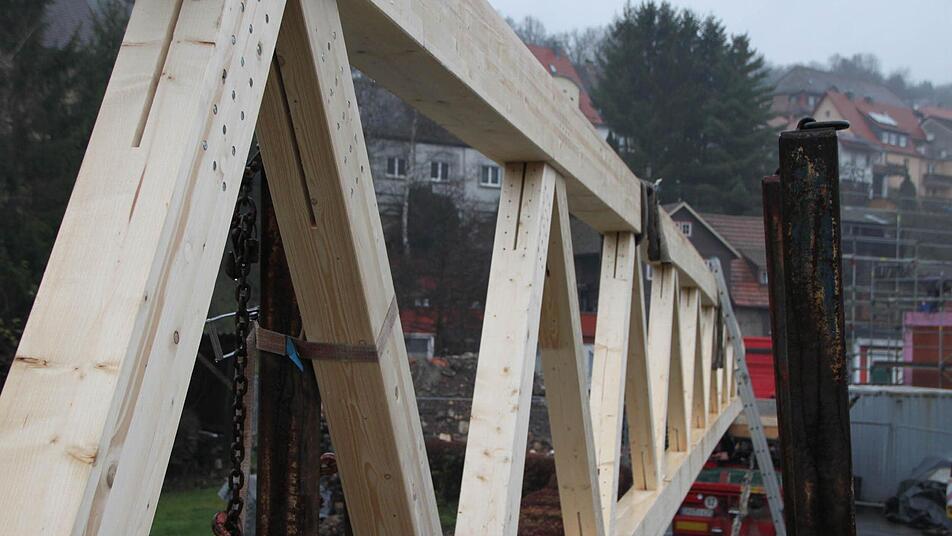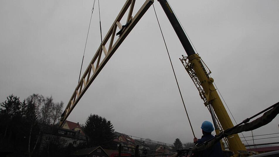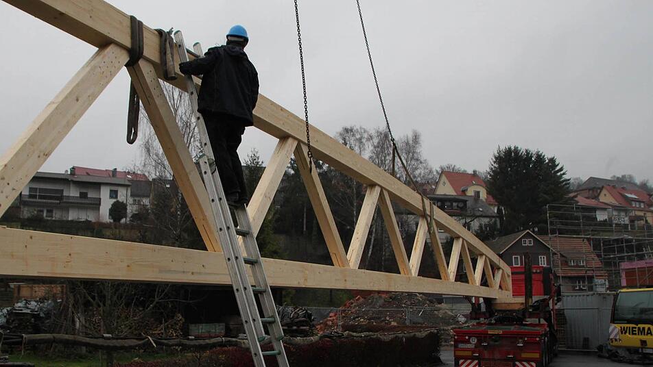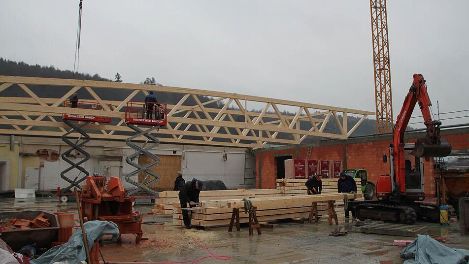 "Die ersten vier Träger machen wir heute", sagt Günter Spindler von der gleichnamigen Firma, die die Holzkonstruktion montiert. Am Dienstag kommen dann noch einmal drei Träger. Sie werden mit einem Spezial-Laster angefahren. Ein Mann sorgt auf dem Parkplatz dafür, dass die Kunden keine Fahrzeuge in den Weg stellen, denn gleich nebenan, im alten Markt, geht der Alltag wie gewohnt weiter.