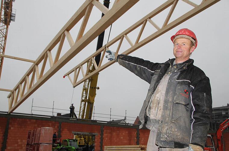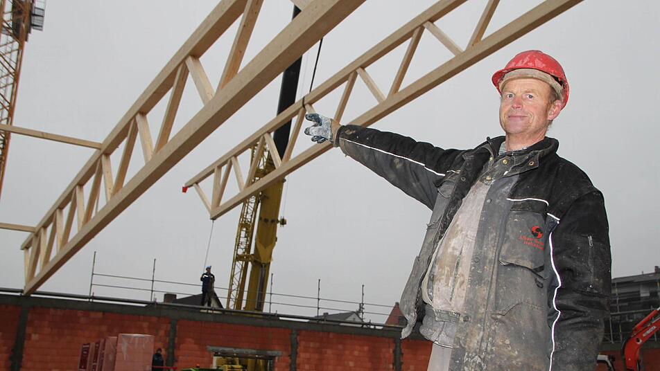 Draußen, auf der Baustelle, steht Roland Wehner. "Mit dem Rohbau sind wir grob fertig.